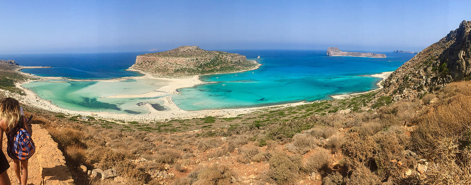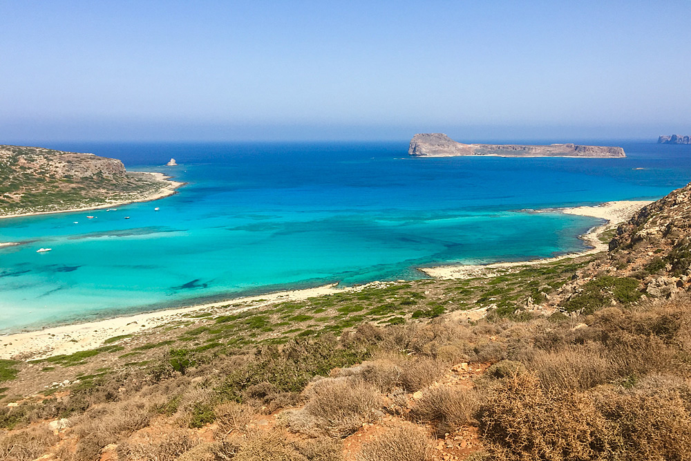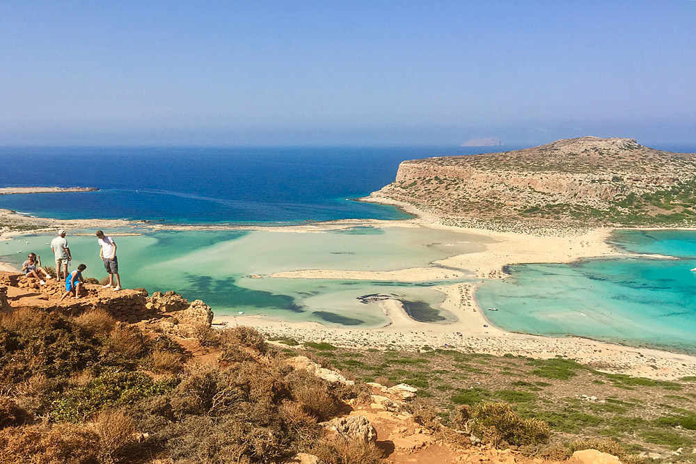 За начальный пункт путешествия берём город Ханья и едем на самый запад, в бухту Балос (Όρμος Μπάλος), где от потрясающих видов замирает сердце. Это место расхваливают все путеводители за чистейшие песчаные пляжи с розовым и белым песком и море всех оттенков синего цвета. А ещё обязательно упоминают тот факт, что в бухте встречаются воды Ливийского, Ионического и Эгейского морей. И именно слиянием нескольких морей объясняется невероятная красота лагуны. Говорят, за день можно увидеть около 15 оттенков воды.