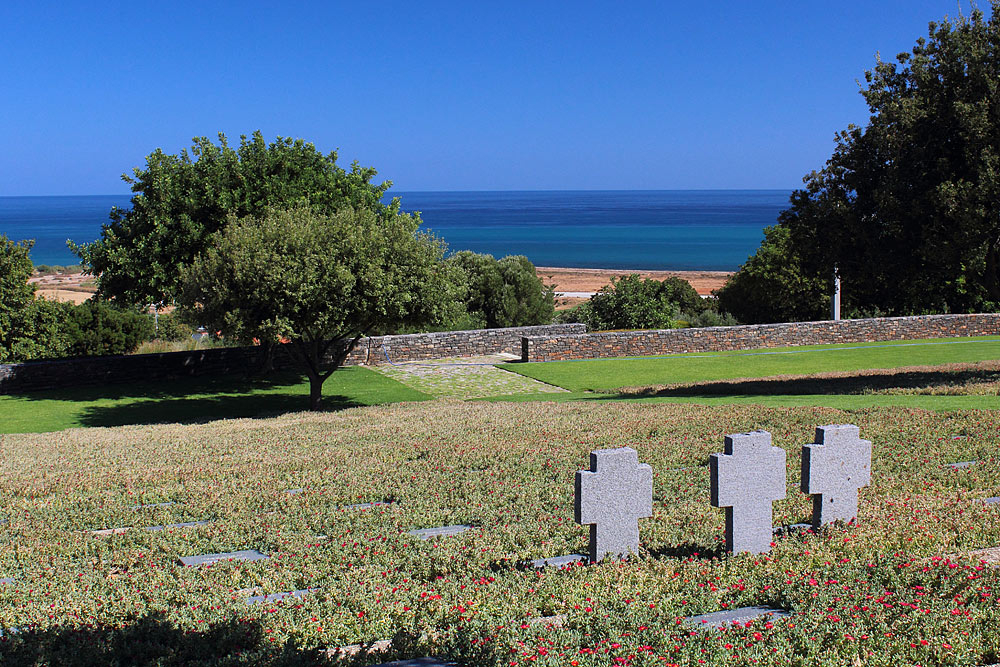 Надо сказать, что это большое, очень ухоженное немецкое кладбище вызывает спорные чувства… Все же прекрасно понимают, кто здесь похоронен. Не военные, защищавшие родину, а захватчики, в большинстве своём те самые нацистские парашютисты, призванные захватить аэродромы и уничтожить защитников острова и мирное население…